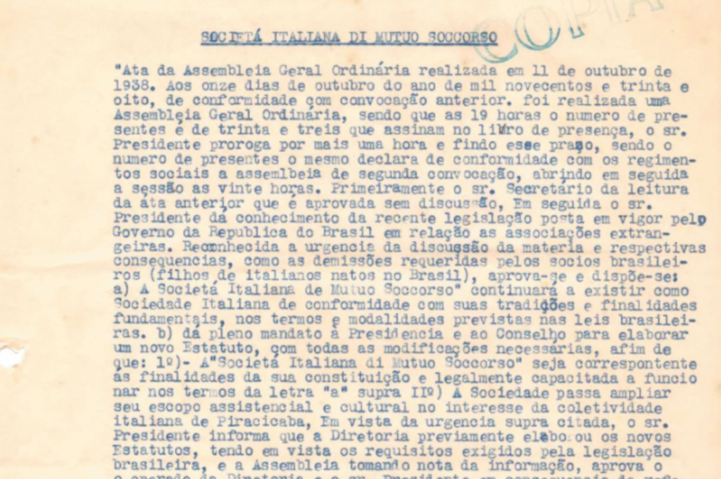 Os documentos que estão neste bloco foram compilados pelo senhor Pedro Vicente Ometto Maurano, diretor da Società Italiana, e pelo arquiteto Marcelo Cachioni, um pesquisador de longas datas sobre a arquitetura piracicabana.