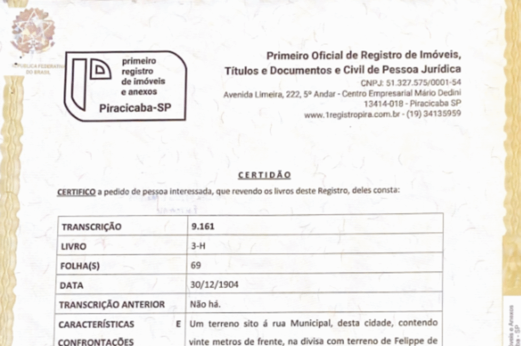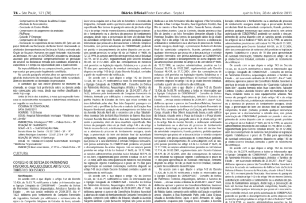 Cópia da Resolução de Tombamento, cópia do Decreto de Tombamento e cópia da publicação no Diário Oficial Municipal de Piracicaba.